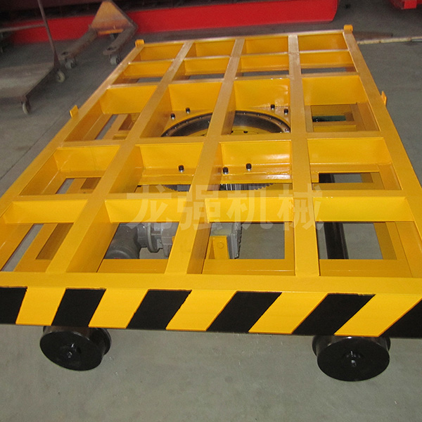 KPT系列電動平車由防爆電機連接減速機減速后,通過鏈輪鏈條旋轉而帶動電動平車滾輪在軌道上行走。電動平車運行時,平臺下方固定連接坦克連一頭,另一頭固定在地平面的溝槽中,坦克連放平后厚度不會高出地平面,不會影響日常其他設備的運作。電纜經坦克鏈直接給電機供電。坦克鏈電纜的一端經地面預埋管直接到控制柜中,另一端經電動平車的固定裝置引入平車。該型電動平車的特點是臺面高度較低,裝卸重物容易,但運行距離不能太長,一般不能超過50m,過長電纜重,坦克鏈會下垂。