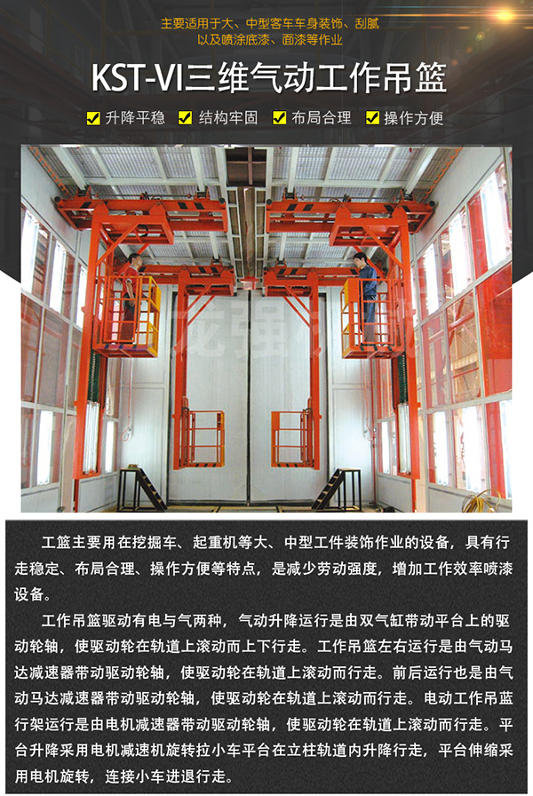 • 工籃主要用在挖掘車、起重機等大、中型工件裝飾作業的設備,具有行走穩定、布局合理、操作方便等特點,是減少勞動強度,增加工作效率噴漆設備。