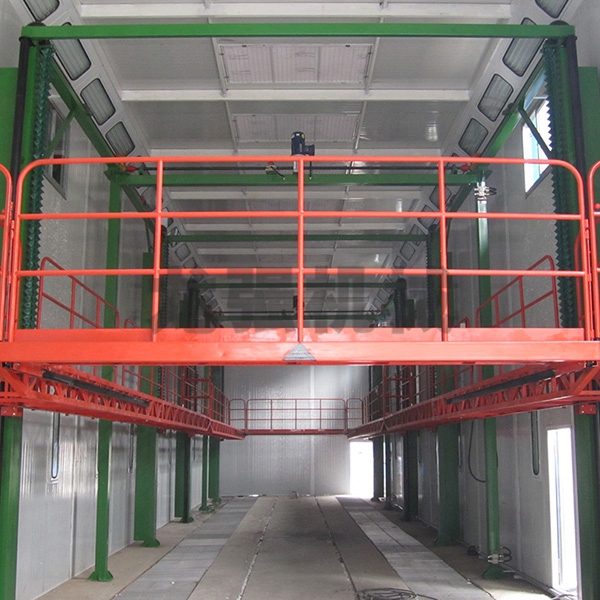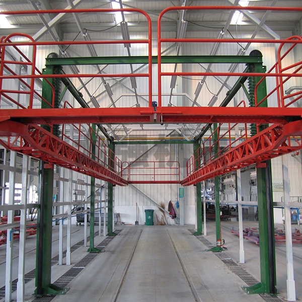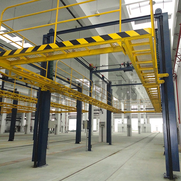 本設備系采用電機連接減速機減速后,通過多軸及鏈輪、鏈條的機械傳動方式改變運動方式,以導向柱導向輪等組成的導向機構,使得操作平臺升降過程的相對穩(wěn)定和整機剛性,在邊立柱的鏈條一端加配重錘,以減少電機工作負荷,減少振動幅度,以達到平臺升降平穩(wěn)的目的,并在平臺貳端設有移動小車,以適應不同車長的需要。采用鋼絲繩保險裝置,鋼絲繩兩端分別與平臺及配重錘連接。當鏈條發(fā)生斷裂時,因鋼絲繩與平臺配重錘連接不至于平臺突然下墜,以便操作人員能及時調整平臺,從而使得操作人員的人身健康。